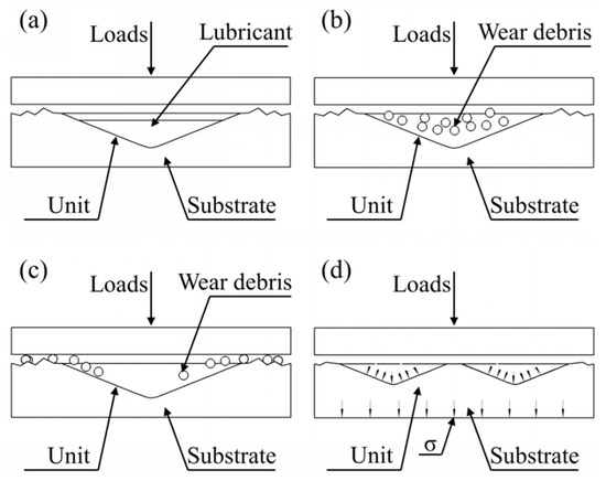 Figure 13a,b show the models of the bionic units capturing and retaining the lubricants, as well as reducing abrasive and adhesive wear. The lubricant trapped in the region of the biomimetic units can be considered a secondary source of lubricant, as it is drawn up by the relative movement to permeate the surface and to reduce the friction and improve wear resistance [37,38]. Compared with the base material, the microhardness of the bionic unit was higher, and the abrasive particles had more difficulty invading the material surface, so the movement mode changed from sliding to rolling (Figure 13c). Due to the biomimetic units, when the abrasive particles slid and rolled on the surfaces and produced grooves, the units could prevent the moving path of the particles or make the movement path segregated, thereby effectively stopping the expansion of the cracks and grooves. The bionic units obtained by laser processing have a special microstructure and higher hardness zones when compared with the smooth surfaces, which improves the overall resistance to deformation. When the coupling area density increased, the area of hardening produced by the laser thermal effect was amplified, which provided strong support for the deformation resistance and improved wear resistance.
