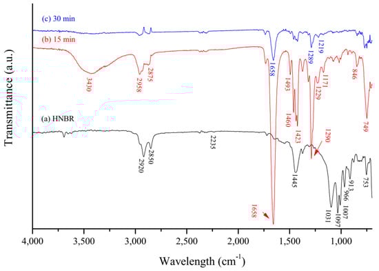 ATR-FTIR spectra of: (a) pristine hydrogenated nitrile butadiene rubber (HNBR), HNBR after immersion in a PVP:CHCl3 solution for (b) 15 min and (c) 30 min and quenching in hexane for 30 min.