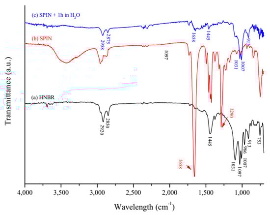 ATR-FTIR spectra of: (a) pristine HNBR, (b) HNBR after surface physical interpenetrating network (SPIN) functionalization and (c) HNBR after SPIN functionalization and immersion in distilled water for 1 h.