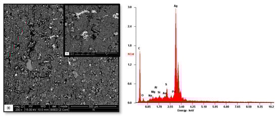 As for any other metal deposition by ELP, Ni-P deposition can only occur if catalytic seeds are present on the substrate surface [30]. Usually, palladium seeds are used for this purpose. In this paper, ENP was performed without using palladium seeds, based on the premise that silver [11,31], copper [7,32], and even nickel nuclei [12] behave as autocatalytic seeds once present on the surface in the form of nano-aggregates. Therefore, the PHNBR was immersed in an AgNO3 aqueous solution in order to form PVP:Ag+ complexes, where the Ag+ charge is stabilized by the non-shared electron pairs of oxygen and nitrogen of PVP [33]. Next, Ag+ was reduced to the metallic form. SEM micrographs and EDS analysis of a PHNBR sample after silver nitrate activation are shown in Figure 5. The abundant white specks in the micrograph correspond to the Ag nanoparticles formed after adsorption of Ag+ species and reduction to Ag0. The fact that silver remains adhered to the surface after 5 min of ultrasonication proves the excellent adhesion that is achieved with the PVP functionalization.