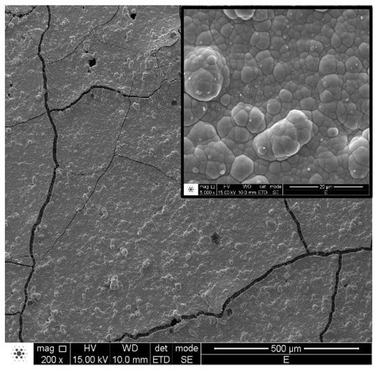 The surface morphology of the Ni-P plated sample is shown in the SEM micrograph of Figure 6. The substrate surface is fully covered by the Ni-P film and a close inspection of the surface of a plated sample, as shown in the inset in Figure 6, leads to the conclusion that the deposition of Ni-P occurs in nodules, in a “cauliflower-like” shape common to electroless plated Ni-P metallic alloys. The particles tend to agglomerate close together, forming a non-porous and well compacted film. The cracks observed on the deposit surface are most likely a consequence of the formation of compressive stresses in the phosphorous deposits [41].