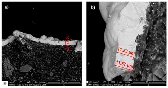 The average thickness of the Ni-P coating is about 3 µm after 60 min plating and, as shown in Figure 8, the thickness increases to ~10–12 µm when the plating time is doubled to 120 min. As the plating starts at the bottom and at the edges around the sample, followed by a lateral growth from outside to inside, there is a thickness difference of ~2 µm between the center (Figure 8a) and at the edges (Figure 8b) of the samples.