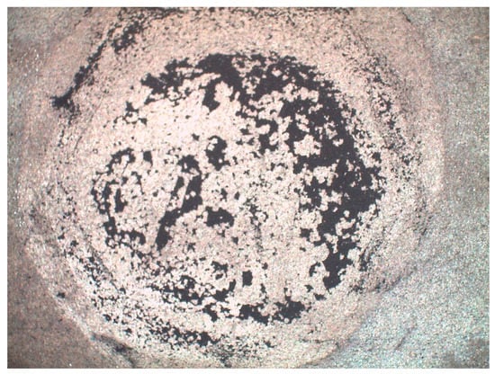 As indicated in Figure 7 by a circle mark, some of the silver nuclei are deeply embedded within the PHNBR composite, which confirms the penetration of PVP into HNBR. These nuclei anchor the Ni-P film to the HNBR substrate, suggesting an excellent adherence of the Ni-P film as evidenced by qualitative evaluation through a Scotch tape test. Around 5% of Ni-P film was detached from the grid which, in accordance with the standard ASTM D3359, results in an adhesion grade of 4B. Additionally, a DPO test was performed showing the predominance of adhesive failure between the Ni-P coating and the epoxy adhesive, although the black parts indicate a failure at the Ni-P/PHNBR interface, as shown in Figure 9. The mean adhesive strength was 1.0 ± 0.5 MPa which is not far from the values reported for electroless plating on other polymeric substrates: 1.65–2.09 MPa for electroless copper plating on acrylonitrile butadiene styrene (ABS) resin [42] and 2.5–4.5 MPa for metallized PEEK via ENP [43].