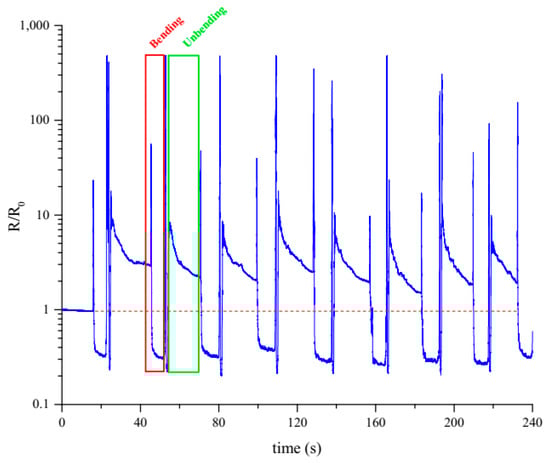 Normalized resistance during 90° bending and unbending of Ni-P plated PHNBR samples, in a logarithmic scale.