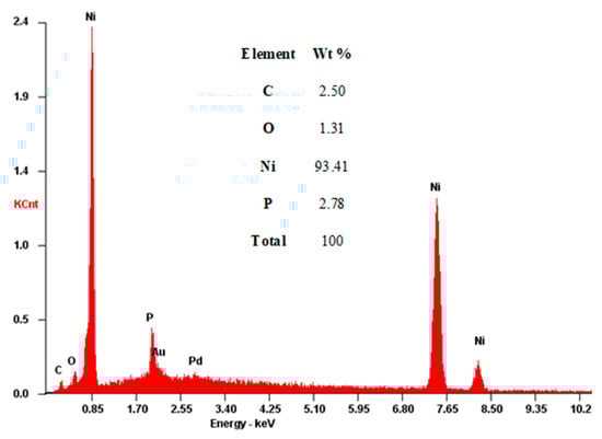 Figure 11 shows an EDS spectrum of the Ni-P plated PHNBR sample deposited at 40 °C for 1 h. As expected, the film consists mostly of nickel and phosphorous. The low phosphorous content (2.78 wt %) is due to the alkaline nature of the plating bath and allows for the classification of the deposit as a low-phosphorous coating [4,5,44,45]. Elemental boron was not detected in the EDS analysis, despite the use of DMAB. Indeed, Wattanabe et al. [40] only found 0.2% of boron in their deposited nickel films (using ~8 g/L of DMAB) while Shao et al. [36] did not detect this element in their silver catalyzed Ni deposition when using 0.2 g/L of DMAB and six times less sodium hypophosphite than that used in this work.