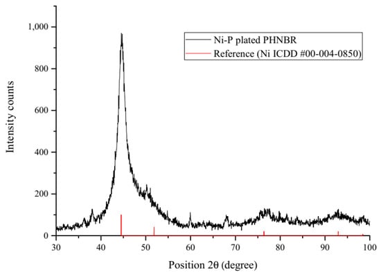 XRD pattern of a Ni-P plated PHNBR sample for 60 min at 40 °C.