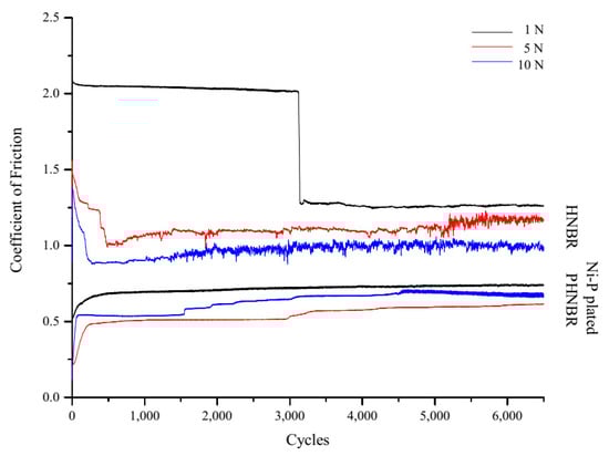 Variation of the coefficient of friction as a function of cycles for pristine HNBR and Ni-P plated PHNBR for one of three samples tested for each load.