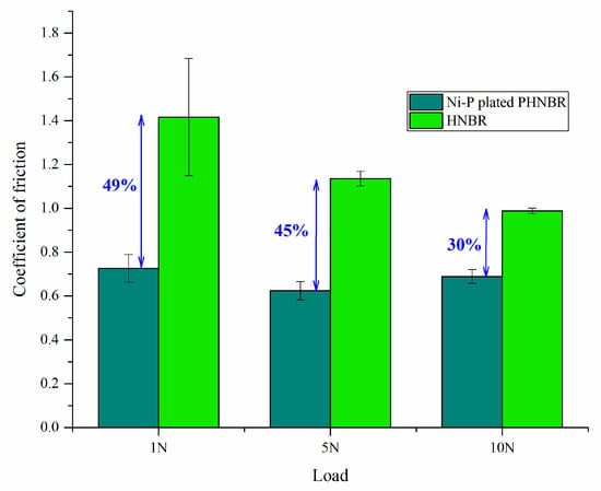 The CoF stabilized values for HNBR and Ni-P-coated HNBR are plotted in Figure 14, showing a decrease of 30–49%, depending on the applied load. The one-way ANOVA analysis for the influence of load on the CoF (p < 0.05) allows the conclusion that while for uncoated HNBR the CoF depends on the load, this is not observed for the Ni-P plated samples. However, this result should be confirmed with a more significant number of samples. It is noteworthy to mention that the CoF values obtained are within the range of those usually measured on Ni-P plated metallic parts such as steel [56,57,58].