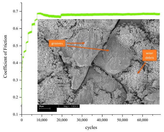 Variation of the coefficient of friction of Ni-P plated PHNBR sample at 5 N for 69,000 cycles and SEM micrograph of the sample after the test.