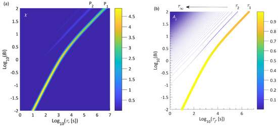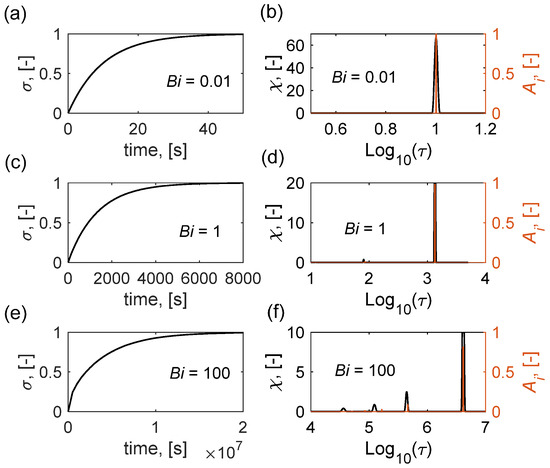 Figure 1 shows the comparison between the various representations of the synthetic ECR data with different Biot numbers. From the time–domain representation of the ECR data (Figure 1a,c,e) under Biot numbers of 0.01 (surface-exchange limited), 1 (surface-exchange & bulk-diffusion co-limited) and 100 (bulk-diffusion limited), it is hard to distinguish the rate-limiting mechanisms. From the reconstructed DCT spectra (the black curves in Figure 1b,d,f), it is shown clearly that the DCT shows a single peak for Bi = 0.01. For Bi = 1 and 100, the second-order peak appears in the DCT, with the strength increasing with Bi. It is noted that, for Bi = 100, the higher-order peaks appeared, which cannot be reconstructed properly by the DCT. These incorrect peaks may be derived from the Tikhonov regularization, since their strengths are negligible as compared to the first-order peaks. The similar problem is also encountered in reconstructing the DRT from the EIS spectrum by Tikhonov regularization [32]. Although the third and higher order peaks may be miscalculated, the first two major peaks with significant strength play a dominant role in visualizing the rate-limiting step. It is shown by the τi–Ai plot that the first- and second-order peaks of the reconstructed DCT agree well with the theoretical solutions (the orange stems in Figure 1b,d,f). Therefore, the reconstructed DCT spectrum can be used to identify the rate-limiting mechanism. To provide a whole picture that how the major peak(s) of DCT evolves with rate-limiting regimes, a contour plot of the reconstructed DCT in the logarithmic Bi–τ axis system is presented in Figure 2a.