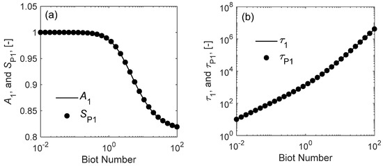 (a) The major peak strength of the reconstructed DCT (the integral area of the peak P1 in Figure 2a, SP1) and the analytical strength of τ1 (A1), and (b) the CTs of the major peak in the reconstructed DCT (τP1) and the analytical values of τ1 of MIEC sheets with k = 10−4 cm·s−1 and D = 10−5 cm2·s−1, as a function of the Biot number.