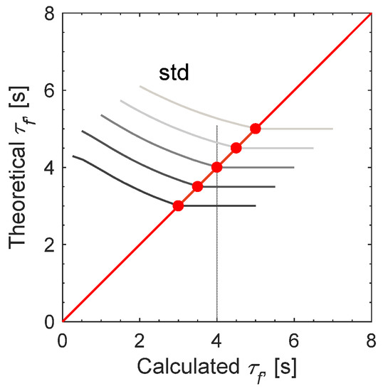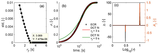 The ECR data was generated using Equation (5) with τf = 3 s, k = 10−4 cm·s−1, D = 10−5 cm2·s−1 and Bi = 0.01. For reconstruction of DCT, a guess of τf must be given, since DCT is constricted to be negative/positive for CTs below/above τf. To determine the value of τf, a parametric sweep study on τf is performed to obtain the evolution of standard deviation between the original ECR and the ECR determined by the reconstructed DCT, as shown by Figure 4a. It is shown that the evolution of standard deviation with τf shows an L-shaped curve. The corner point of the L-shaped curve can be used as a good estimator of τf, which was estimated to be 3.07 s for this case (very close to the theoretical value of 3 s). Figure 4b shows the comparison of the original ECR and the DCT-fitted ECR, showing that the ECR could be perfectly fitted by the DCT when a correct value of τf is given. The corresponding DCT spectrum, as shown by Figure 4c, shows a negative peak at the CT of 3 s. To check the effectiveness of the procedure, a case study of τf with different values are shown in Figure 5, showing that the values of τf can be estimated correctly by the L-shaped curve of standard deviation.