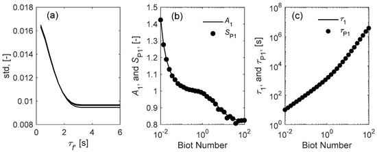 Another factor that influences the quality of ECR data is the noisy perturbations. Therefore, the robustness of DCT reconstruction using noise-containing ECR data must be verified for practical usage. Based on the flush-delay-imbedded ECR, the effect of noise on the DCT reconstruction was studied by adding a random Gaussian noise with a standard deviation of 1% in the ECR data in Figure 4. Figure 6a shows the L-shaped curves of standard deviation for three-times repeats of parametric sweep on τf, showing that a correct value of 3 s can be estimated. To check if the correct values of SP1 and τP1 can be resolved from the DCT, the noise-containing ECR data with different Biot numbers were simulated. Figure 6b,c shows that the values of SP1 and τP1 resolved from the reconstructed DCT agreed nicely to the analytical values.