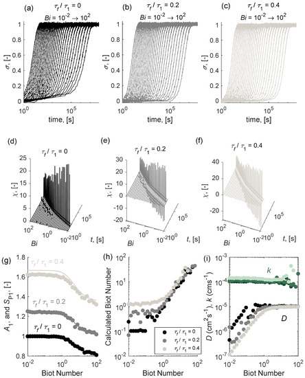 Finally, we demonstrated the capability of determining the values of k and D using the DCT spectrum reconstructed from noise-containing ECR data with different levels of flush delay (τf/τ1 = 0, 0.2, 0.4) and Biot numbers (Bi = 10−2 ~ 102), as shown in Figure 7a–c.