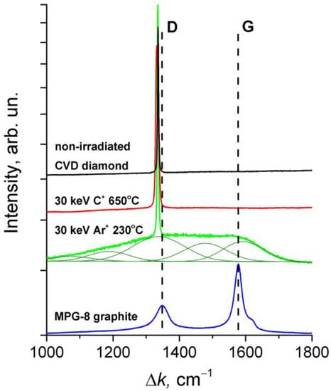 - Borisov, A.M.; Kazakov, V.A.; Mashkova, E.S.; Ovchinnikov, M.A. The regularities of high-fluence ion-induced graphitization of diamond. Vacuum 2018, 148, 195–200. [Google Scholar] [CrossRef]