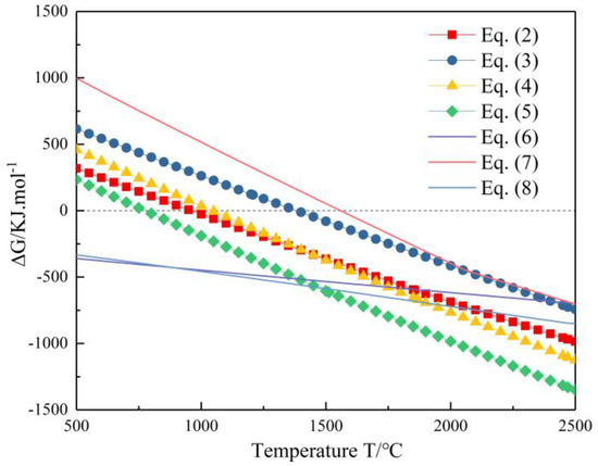 For the reactions in this study, the Gibbs free energy values were calculated using FactSage software (version 8.0). B2O3 usually bonds to the surfaces of B4C particles, reacting with B4C during the heating process and releasing gas. The fly-off from the gas inhibits densification. The reaction also causes grain growth during ceramic sintering. The reactions between B4C and MeOx involved in the sintering process are as follows: