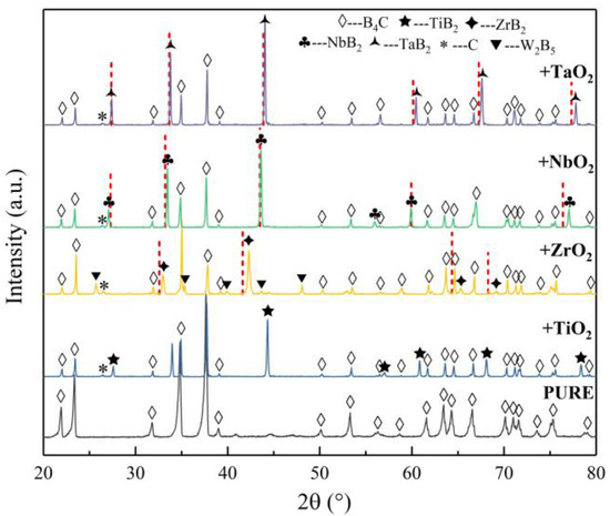 Table 2 shows the relative densities of the final products. The relative density of the pure sample was 78.3%. It can be clearly seen from the data in Table 1 that the addition of MeOx significantly increased the samples’ densification. Except for the TiO2-added sample (relative density of 89.3%), the relative densities of other B4C-MeB2 multiphase ceramics exceeded 93%.