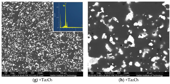 Figure 3 shows the microsurfaces of different samples through SEM images. Overall, the samples contained several pores. The main component of the second phase was the (Me, W)B2 solid solution. The resulting XRD patterns (Figure 2) and energy spectra (Figure 3) confirmed this. As shown in Figure 3a, the TiO2-added sample consisted of a dark grey matrix, as attributed to B4C, with the light grey second phase as attributed to (Ti, W)B2. These second-phase particles were uniformly distributed but the number of pores was larger than in other particles. Additionally, the particle diameters for (Ti, W)B2 samples were smaller than those of other samples. Figure 3b shows that there is a small number of pores in the ZrO2-added sample, in which the light grey (Zr, W)B2 solid-solution phase and bright white W2B5 phase were evenly distributed. Figure 3c shows that the Nb2O5-added sample exhibited a high density without distinct pores, in which the (Nb, W)B2 solid-solution phase can be observed as a white phase. Figure 3d shows the Ta2O5-added sample, whose (Ta, W)B2 solid-solution second phase had a similar distribution to the (Nb, W)B2 solid-solution phase in the Nb2O5-added sample.