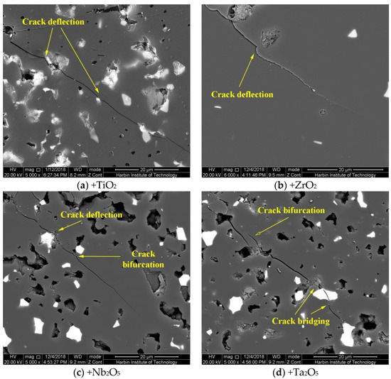 Additionally, the particle size, particle shape, particle orientation, surface energy, and interfacial bonding condition of the particles were determined to be the factors that could change the fracture toughness of the final products in this study. As shown in Figure 5, compared with the ZrO2-added product (Figure 5b), the rest of the samples performed better in terms of the average second-phase particle distribution and having suitable particle sizes. Such results could help explain the higher fracture toughness values of these samples, as detailed in Table 4. As for the Nb2O5-added sample shown in Figure 5c, it can be seen that the crack was deflected rather than directly passing through upon encountering the second phase. This phenomenon could provide proof that the Nb2O5 additive had a significant second-phase toughening effect as it induced a high energy consumption. The fracture toughness of the Ta2O5-added sample was found to be slightly larger than that of the Nb2O5-added sample, whose cracks passed through the second phase. The energy from the crack propagation was largely consumed in this sample, with bifurcation and deflection occurring frequently. It was proven that Ta2O5 and Nb2O5 additives had a significant second-phase toughening effect.