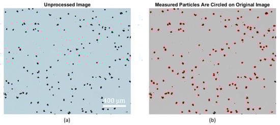Powder samples were taken from the Al6061 and Cu batches intended for use in particle velocimetry measurements. Powder characterization was conducted via optical microscopy in the transmitting light mode. Particles were spread on a glass slide and separated by agitation. Fifteen microscope images were taken with a high-resolution Zeiss Axioscope 7 optical microscope (Oberkochen, Germany). Images of particles on glass slides were binarized and analyzed through an algorithm written in MATLAB (MathWorks, Natick, MA, USA). In Figure 1, a sample raw microscope image can be seen along with a processed image.