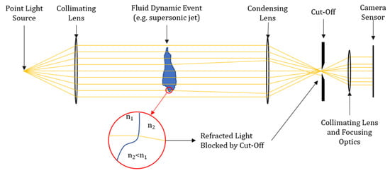 In this setup, light from the pinhole is collimated by the first lens. The supersonic jet exiting the spray nozzle is located between the two lenses in the test section. Light is refracted due to the density gradients in the jet and is refocused down to a point by the second lens. A razor blade used as cut-off blocks some of the refracted light, and the remaining light is imaged by the camera. A monochromatic image appears in the camera with bright and dark regions, which correspond to lower and higher density gradients, respectively. An illustration of a similar setup is given in Figure 2.