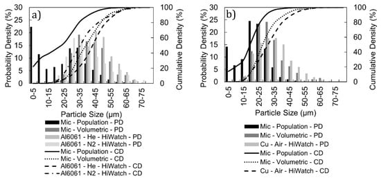 Population and volume-based probability density (PD) and cumulative density (CD) are plotted for powder particles measured by high resolution optical microscopy (a) for Al6061 and (b) for Cu. The population based and volumetric distributions are compared with the population-based size distributions measured by the Oseir HiWatch particle velocimeter during cold spray experiments.