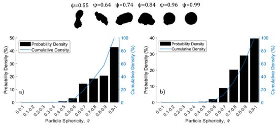 Probability and cumulative distributions of particle sphericity as measured by high resolution optical microscopy are plotted with representative particle images for (a) aluminum and (b) copper powders independent of particle size.