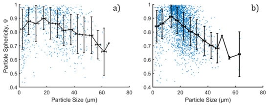 Size dependent particle sphericity measurements are plotted for (a) aluminum and (b) copper powders. Variability of particle sphericity depending on the particle size are plotted in 5 μm intervals with error bars representing plus or minus one standard deviations.