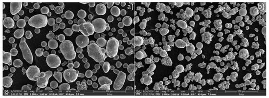 SEM images (Figure 7) show that both powders include particles of spherical and off-spherical nature. Aluminum powder particles appear to include few satellite particles whereas most copper particles have satellites with many appearing to be well adhered. Larger particles in both batches are observed to be more elongated than smaller particles. Furthermore, copper powder (Figure 7) is mainly made up of agglomerated particles with many surface features that increase the surface area of particles.