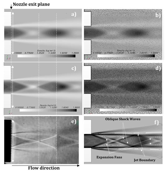 Furthermore, coarse and refined mesh density simulations provided similar results as evidenced from the density contour plots (Figure 8a–d). The model that was refined in the supersonic jet region provided a better resolution of the expansion and shockwaves as expected. However, no significant difference was found in the continuous phase flow properties upstream of the nozzle exit plane. This is evidenced by plotting the Mach number along the axis of the computational models (Figure 9).