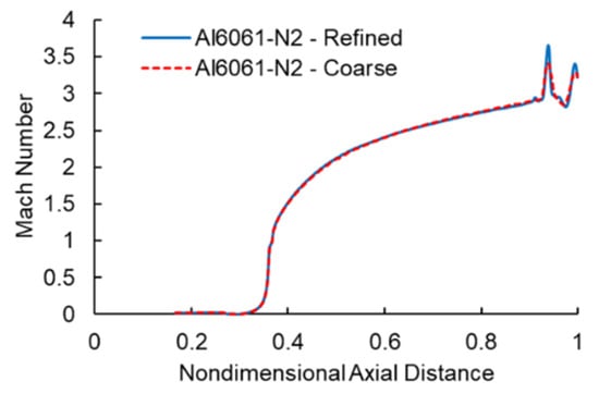 Plot of Mach number along the axis of the coarse and refined computational models for case Al6061-N2. Nondimensional axial distance is the ratio of the axial distance to the overall axial length of the model.