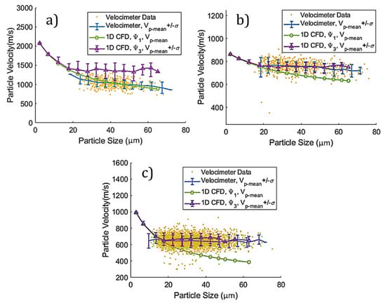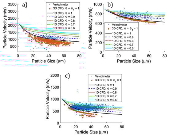 Size dependent particle velocity as measured by the HiWatch particle velocimeter and predicted by CFD for (a) Al6061-He, (b) Al6061-N2, and (c) Cu-Air cases. Outputs from 3D-CFD simulations with perfectly spherical particle () assumption are provided in these plots. Velocity plots are from 1D-CFD simulations that were carried out by assuming particle sphericities of 0.6, 0.7, 0.8, 0.9, and 1.0 for all three cases.