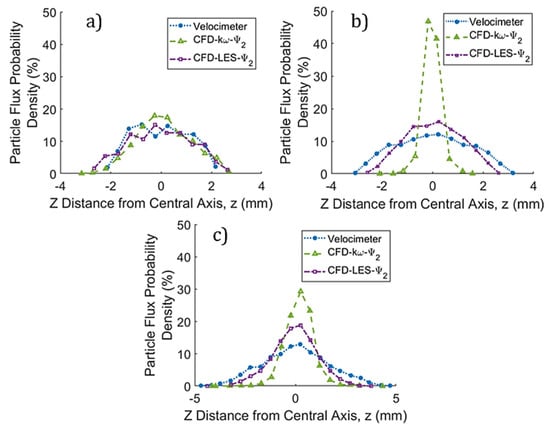 Probability distribution of particle flux given with respect to distance from the axis of the jet (z-direction as given in Figure 3) as measured from the HiWatch particle velocimeter, predicted using 3D-CFD with k-ω SST turbulence model, and predicted using 3D-CFD with the Large Eddy Simulation (LES) turbulence model. The data are plotted for (a) Al6061-He, (b) Al6061-N2, and (c) Cu-Air. 3D-CFD data are filtered to only include data for particles crossing the outlet boundary in the range of −0.2 mm < y < 0.2 mm.