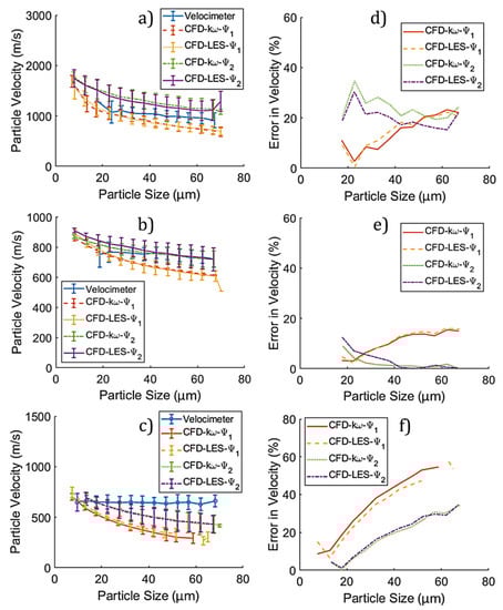 Size dependent average particle velocity and standard deviations are plotted using 5 µm intervals as measured/predicted from: HiWatch particle velocimeter; 3D-CFD simulations with realizable k-ω SST turbulence model and perfectly spherical particle assumption (CFD-k-); 3D-CFD simulations with LES turbulence model and perfectly spherical particle assumption (CFD-LES-); 3D-CFD simulations with realizable k-ω SST turbulence model and randomized particle sphericity assumption (CFD-k-); and 3D-CFD simulations with realizable k-ω SST turbulence model and randomized particle sphericity assumption (CFD-LES-). Figure 12a–c are given for Al6061-He, Al6061-N2, and Cu-Air cases, respectively. Error in the model predictions with respect to the particle velocimetry measurements are plotted in (d–f) for Al6061-He, Al6061-N2, and Cu-Air cases, respectively. Outputs of simulations are filtered to −0.2 mm < y < 0.2 mm to correspond with the actual velocity measurement region Figure 3.