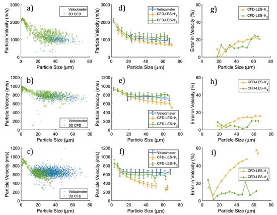 The error sustained in the Al6061-He case (Figure 13g) can also be partially attributed to three dimensionality effects. Particle dispersion in Al6061-He is predicted accurately (Figure 11a), but stronger boundary layer effects than predicted can reduce gas velocity and the cross-sectional gas velocity profile. This can lead to further reduction in particle velocity. The three-dimensional effects are apparent when 3D-CFD (Figure 13d) and 1D-CFD (Figure 14a) results are compared. The 3D-CFD- prediction given in Figure 13d is closer to particle velocity measurements in comparison to the 1D-CFD- predictions given in Figure 14a. The overlap between the 1D-CFD- simulation results and the velocimetry measurements (Figure 14a) are not the result of the use of correct models but the result of the offset caused by both ignoring the boundary layer effects and the particle sphericity. In future studies, the sensitivity of the schlieren system (Section 2.2.3) will be increased to visualize the helium supersonic jet stream to increase the confidence in helium gas dynamic calculations.