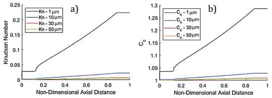 (a) Knudsen numbers and (b) Cunningham correction factors are plotted for 1, 10, 30, and 50 µm particles traveling along the axis of the flow from particle injection to the measurement plane for Al6061-He.