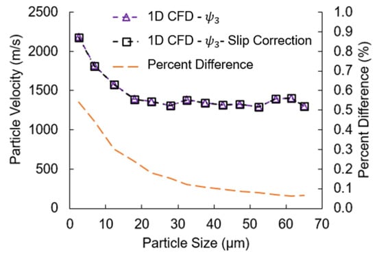 Particle velocity predictions are plotted for the Al6061-He case from simulations that use the size dependent particle velocity data () at 25 mm downstream of the VRC nozzle NZZL0071. Two simulations that exclude and include the Cunningham correction factor are compared. The percent difference between the two velocity curves is also plotted.