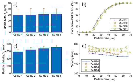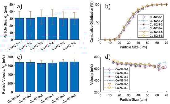 To check the repeatability of velocimetry measurements, in-flight velocities of copper particles were recorded in six separate experiments for the Cu-N2-3 case. Results from in-flight particle size and velocity measurements are given in Figure 18. A one-way analysis of variance study indicates that the particle size means and variabilities in Cu-N2-3-3 and Cu-N2-3-4 are different than the rest of the tests (Figure 18a,c). The average particle size in Cu-N2-3-3 and Cu-N2-3-4 is reported to be ~2 µm higher than the rest of the tests (Figure 18a) and this reflects as 15–20 m/s lower particle velocities (Figure 18c), which is tested by a one-way analysis of variance. Therefore, in Cu-N2-3-3 and Cu-N2-3-4, the particle sample pool consists of larger particles resulting in lower velocities, which may not be representative of the actual particle stream. To confirm that the particle velocity in Cu-N2-3-3 and Cu-N2-3-4 are in fact different than the rest of the measurements, size dependent particle velocities must be compared. Plots in Figure 18d validate the process change resulting in lower particle velocities in Cu-N2-3-3 and Cu-N2-3-4 and the velocity difference appears to increase as the particle size increases. This thorough analysis provides a higher level of confidence in confirming that experiments Cu-N2-3-3 and Cu-N2-3-4 produced lower particle velocities than the rest of the experiments, which resulted in similar average size, average velocity, and size dependent velocity.