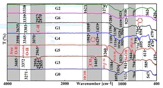 Analysis of the FTIR spectra showed characteristic bands for each type of organic network modifier. Therefore, in the case of alkyl groups, the asymmetric and the symmetric stretching vibrations of the methylene group are found at 2924–2927 and 2855–2870 cm−1, respectively. The stretching vibration of the CH aromatic groups is seen around 3050–3070 cm−1, while for methyl groups, it is found at 2965 cm−1. The broad band characteristic for hydrogen-bonded O-H groups is situated at 3271–3372 cm−1 and is shifted to higher wavenumbers as the capacity of the organic group belonging to the modifier to hinder the formation of hydrogen bonds is higher. Moreover, in the case of G1, G3, and G4 are seen bands corresponding to the stretching vibration of free O–H groups situated at 3598–3685 cm−1.