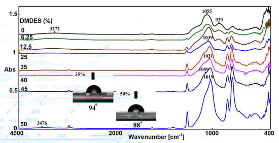 ATR-FTIR spectra and water contact angle of some G5 films obtained at different dimethyldiethoxysilane (DMDES) loadings.