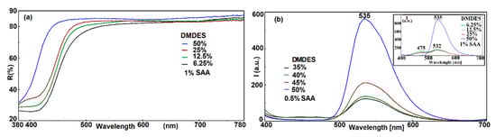Reflectance (a) and fluorescence emission spectra (b) of G5 films at different DMDES loadings. (The inset shows the intensity of fluorescence emission at lower DMDES loadings).