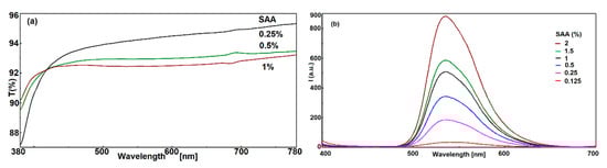 One of the factors is the transmittance of the hybrid film, because fluorescent films in light concentrators must have a high value of transmittance. In the case of G5 hybrid films, higher SAA loadings increases the fluorescence intensity, but the transparency decreases as a result of light scattering. This is due to aggregation of SAA molecules by hydrogen bonding and π–π stacking interactions and the segregation of aggregates in the hybrid film. In the case of G550 hybrid films, the upper limit is 1% SAA by weight, which leads to a transmittance value higher than 92%, as can be seen in Figure 5a. Beyond this limit, the films become much less transparent. The transmittance of the same film containing 2% by weight SAA decreases significantly below 90%, which is unacceptable for the envisaged application.