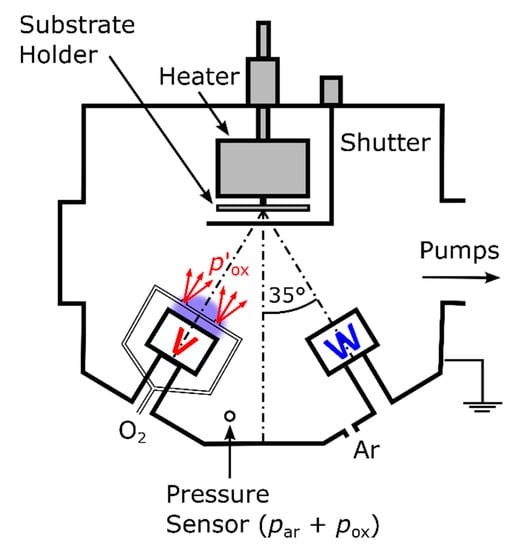 The V0.984W0.016O2 layers were deposited by controlled HiPIMS of a planar V target (99.9% purity, diameter of 50 mm and thickness of 6 mm), combined with a simultaneous pulsed dc magnetron sputtering of a planar W target (99.9% purity, diameter of 50 mm and thickness of 6 mm) at the substrate surface temperature Ts = 330 °C (see Figure 1). This Ts value was maintained during the deposition by a built-in infrared heating system calibrated using a thermocouple directly attached to the substrate surface (additional heating effect by the plasma included). The magnetron with the V target was driven by a unipolar high-power pulsed dc power supply (TruPlasma Highpulse 4002 TRUMPF Huettinger, Zielonka, Poland). In this work, the voltage pulse duration was 80 µs at a repetition frequency of 625 Hz (duty cycle of 5%) and the deposition-averaged target power density (spatially averaged over the total target area) was 13.5 W·cm−2. The magnetron with the W target was driven by a unipolar pulsed dc power supply (IAP-1010 EN Technologies Inc., Gunpo-si, Korea). The voltage pulse duration was 16 µs at a repetition frequency of 5 kHz (duty cycle of 8%) and the deposition-averaged target power density was 35 mW·cm−2.