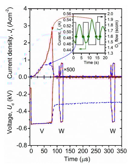 The basic principle of the pulsed O2 flow control is illustrated in Figure 2, which shows the time evolution of the magnetron voltage (Ud(t)) and the target current density (Jt(t)), averaged over the total target area, for both targets at the minimum (pox ≈ 0.02 Pa) and maximum (pox ≈ 0.05 Pa) value of the oxygen partial pressure in the vacuum chamber corresponding to the minimum and maximum d, respectively, during the deposition. The much higher values of Jt(t) for the V target at the highest pox, leading to a maximum V target power density of 1.4 kW cm−2 in a pulse, can be explained []: (1) by a significantly enlarged flux of the  and  ions, arising in front of the partly oxidized V target (due to a higher p’ox), and (2) by an increased secondary-electron emission yield of the V target with a larger compound coverage, particularly for the impacting  and  ions []. A slow decrease in Ud(t) after the negative voltage pulse measured for the V target at pox ≈ 0.02 Pa (see Figure 2) is a result of a slow discharging of the power supply capacitor owing to a very low Jt(t) at the moment of the Ud pulse termination.