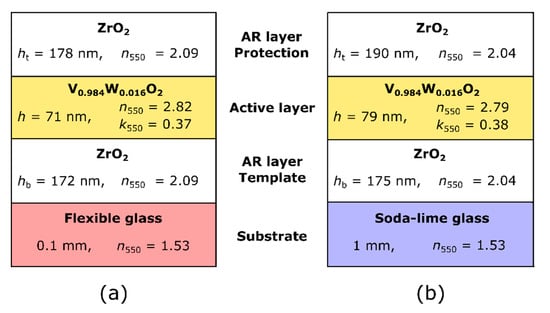 - Houska, J.; Kolenaty, D.; Vlcek, J.; Barta, T.; Rezek, J.; Cerstvy, R. Significant improvement of the performance of ZrO2/V1−xWxO2/ZrO2 thermochromic coatings by utilizing a second-order interference. Sol. Energy Mater. Sol. Cells 2019, 191, 365–371. [Google Scholar] [CrossRef]