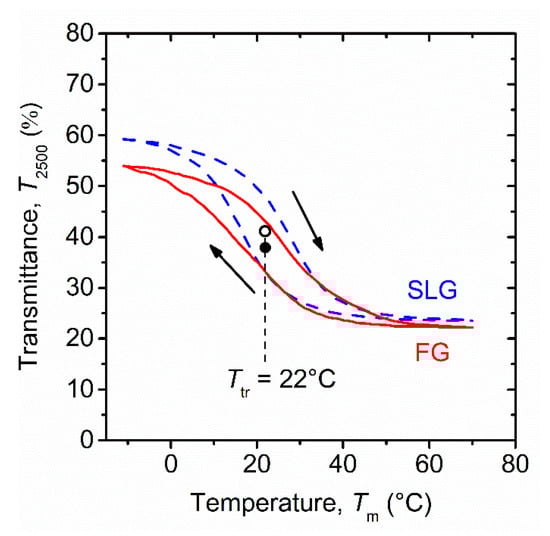 Figure 4 shows the transition temperature (Ttr) of the coatings prepared on FG and on SLG, defined as the temperature leading to a half of the total T2500 change (averaged over the heating and the cooling part of the hysteresis curve). Let us recall that the hysteresis curves, and thus also the Ttr values, are fully reproducible for these stable thermochromic coatings (see Section 2.2). It can be seen that in agreement with the same elemental composition of the active layers in both coatings (guaranteed by a rotating substrate holder; see also Figure 3 for almost substrate-independent n550 and k550 of these layers), both coatings exhibit the same Ttr = 22 °C. Doping the metal sublattice by 1.6 at.% of W decreased Ttr from 57 °C, which was exhibited by thin films of pure VO2 prepared by us using the same technique [], i.e., at a gradient rate of −22 °C/at.% (consistent with the overview in []). Let us emphasize that the presented deposition technique allowed us not only to achieve a smooth and reproducible control of Ttr in itself, but it allowed us to achieve it at a preserved strength of the thermochromic effect (Section 3.4). The presented combination of a lowered Ttr with a high Tlum and ΔTsol is unlike the previously reported lowering of Ttr at the cost of a drop of ΔTsol [,]. Let alone those efforts to prepare VO2-based coatings onto PET foils using hydrothermal synthesis, which did not lead to similarly low Ttr at all [,].