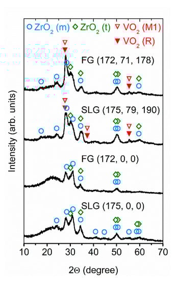 The crystal structure of the bottom ZrO2 layers and of the whole three-layer coatings is shown in the bottom and in the top part of Figure 5, respectively. Regarding bottom ZrO2 layers by themselves, the most important piece of information is their crystallinity in itself, confirming its role of a template layer for the growth of V0.984W0.016O2. There are mostly monoclinic ZrO2 crystals (PDF#04-013-6875 []), with a contribution of tetragonal ZrO2 crystals (PDF#01-081-1544 valid for ZrO1.95, particularly visible in that XRD spectrum on FG which includes also the top ZrO2 layer). Regarding V0.984W0.016O2, the most important piece of information is that there is no trace of any undesired VOx phase. All peaks are identified as diffraction peaks of either the low-temperature thermochromic phase VO2(M1) (PDF#04-003-2035) or the high-temperature thermochromic phase VO2(R) (PDF#01-073-2362). These two phases are difficult to distinguish and they are actually expected to be present simultaneously because the room-temperature XRD measurements took place almost exactly at the thermochromic transition temperature. See, e.g., the strongest peak around 2Θ = 27.8°, corresponding well to theoretical positions of the VO2(M1) (011) planes and the VO2(R) (110) planes (2Θ = 27.80° and 27.91°, respectively). In agreement with Figure 3 and Figure 4, Figure 5 also does not show any convincing difference between the two coatings and confirms the successful transfer from the SLG to the ultrathin FG substrate.