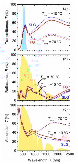 Spectral transmittance (T), reflectance (R) and absorption (A) at an angle of incidence of 7° for the ZrO2/V0.984W0.016O2/ZrO2 coatings on 0.1 mm thick FG (solid and dashed lines) and 1 mm thick SLG (dash-dotted and dotted lines) substrates at Tms = −10 °C (significantly below Ttr = 22 °C) and Tmm = 70 °C (significantly above Ttr = 22 °C). The boundaries of the shaded areas represent the luminous sensitivity of the human eye (φlum) in panel (a), and the sea-level solar irradiance spectrum (φsol) at an air mass of 1.5 in panels (b,c), normalized to maxima of 100%.