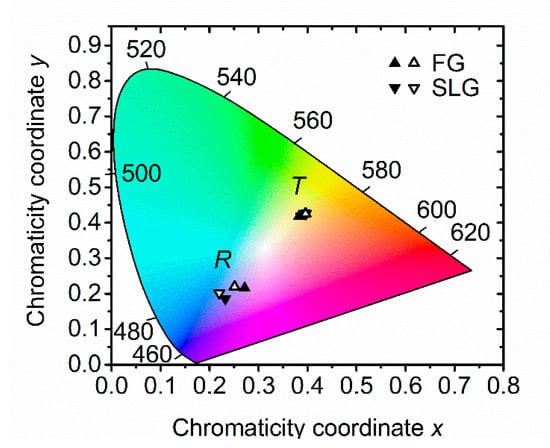 Chromaticity of the coatings shown in the CIE xy chromaticity diagram. There are data below Ttr (full symbols) and above Ttr (empty symbols), obtained on the ultrathin FG substrate (triangles up) and SLG substrate (triangles down) using the transmittance (T) and the reflectance (R) presented in Figure 6.