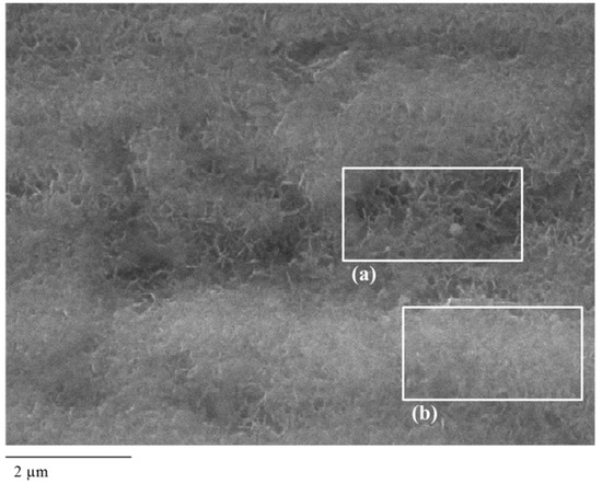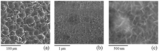 The roughness (Ra) of the SLS aluminum substrate was 0.30 µm, and after the boiling process a boehmite layer of about 500 nm of thickness was obtained [31]. Differently than SHP, in the SEM images of SLS (Figure 2), the nano-grass-like pseudo-boehmite is partially hidden; only some pinnacles are visible. In fact, the Dyn-50 completely fills up the nanovoids in the pseudo-boehmite layer and the surface is almost totally covered by a much thicker layer than the FAS one. The thickness is calculated at about 1 µm according to the gravimetric analysis and the Landau–Levich model [33].